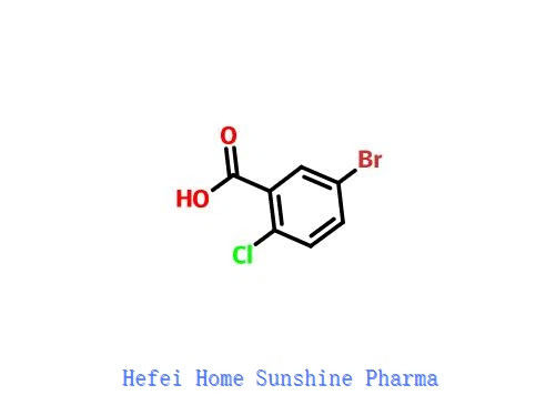 L' acido 5-bromo-2-clorobenzoico è utilizzato come materiale di partenza nella sintesi di dapagliflozina,un inibitore selettivo del cotrasportatore sodio-glucosio-2 che riduce il riassorbimento renale del glucosio ed è usato per il trattamento di pazienti con diabete di tipo 2.