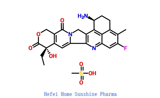 L' esatecano mesilato è un derivato semisintetico idrosolubile della camptotecina con attività antineoplastica.L' esatecan mesilato inibisce l' attività della topoisomerasi I stabilizzando il complesso cleavabile tra la topoisomerasi I e il DNA e inibendo la regenerazione delle rotture del DNA., inibendo così la replicazione del DNA e innescando la morte apoptotica delle cellule.Questo agente non richiede attivazione enzimatica ed è più potente della camptotecina e di altri analoghi della camptotecina.L' Exatecan Mesylate (DX8951f) è un inibitore della topoisomerasi I con un valore IC50 di 2,2 μM (0,975 μg/ ml) per la ricerca sul cancro.